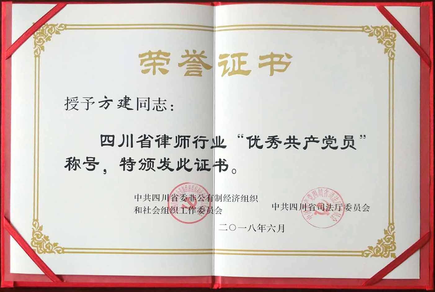 2018年6月26日,在四川省律师行业先进党组织,优秀共产党员表彰大会上,我所方建律师以其优异表现获得四川省律师行业优秀共产党员称号。
