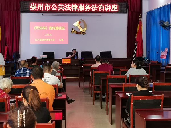 2021年9月28日,为增强社区居民法律意识,推进和谐社区建设,成都市律师协会崇州工作站副主任、中共四川禧建律师事务所联合党支部支部书记、四川禧建律师事务所主任方建作为主讲老师,现场为崇州市廖家镇高庆村村民委员的社区居民通俗易懂地讲解《民法典》相关知识要点,提高了广大社区居民的法律意识。