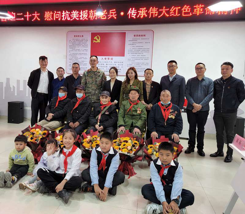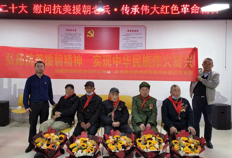 2022年10月15日,为喜迎二十大,进一步弘扬伟大的抗美援朝精神,向老战士致敬,崇州市人民武装部、崇州市委宣传部、崇州市退伍军人事务局、成都市律师协会崇州工作站、中共禧建律师事务所党支部等单位在崇州市崇阳街道明湖社区开展了慰问抗美援朝老兵活动。